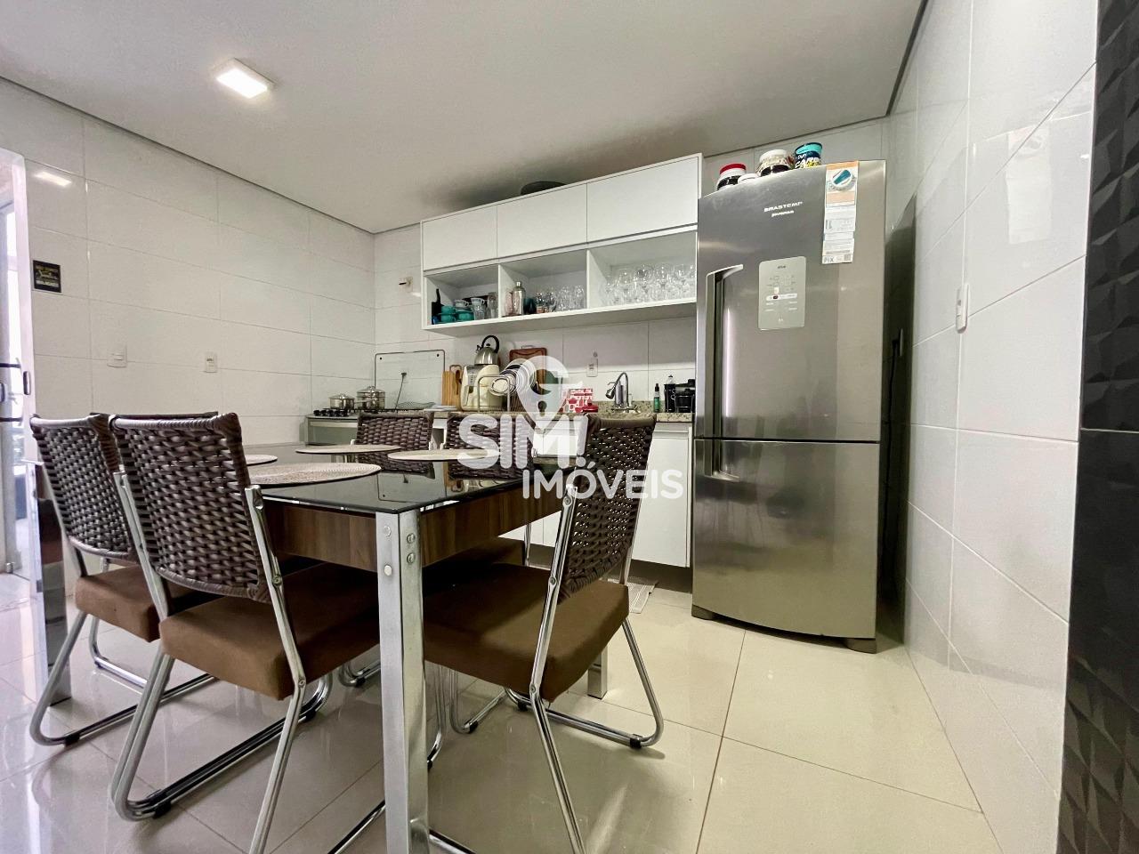Cozinha com móveis planejados, geladeira e fogão;